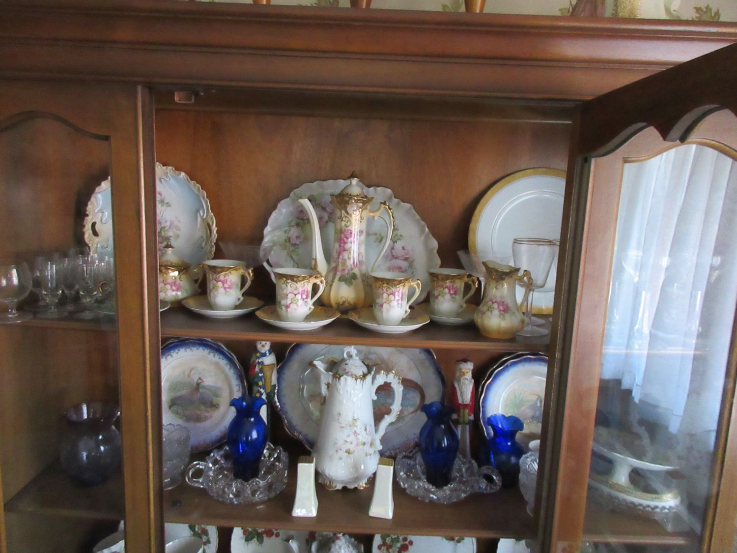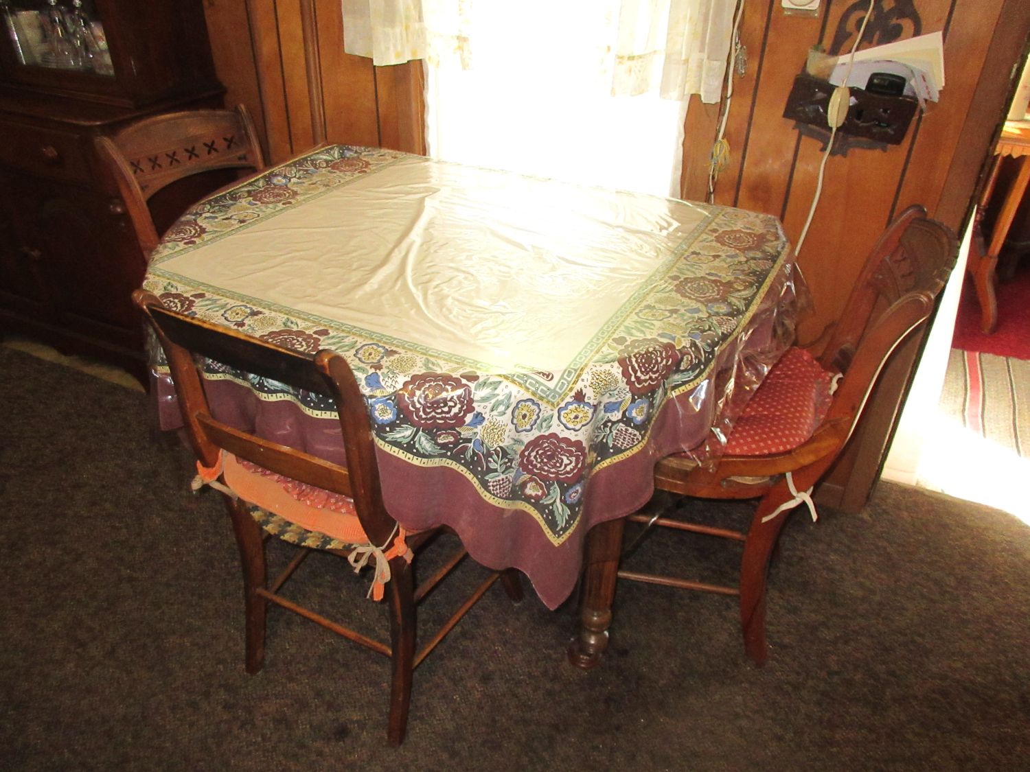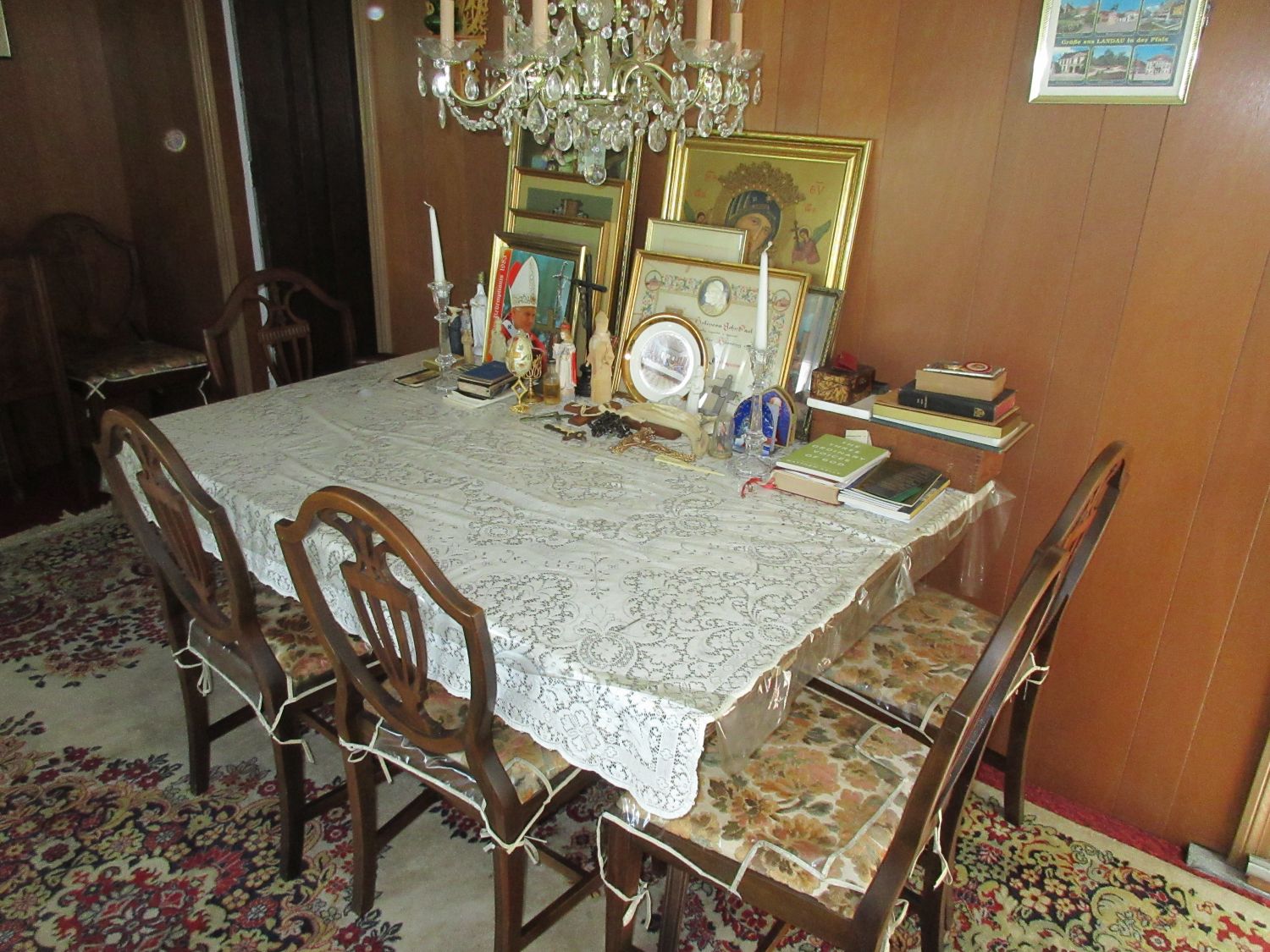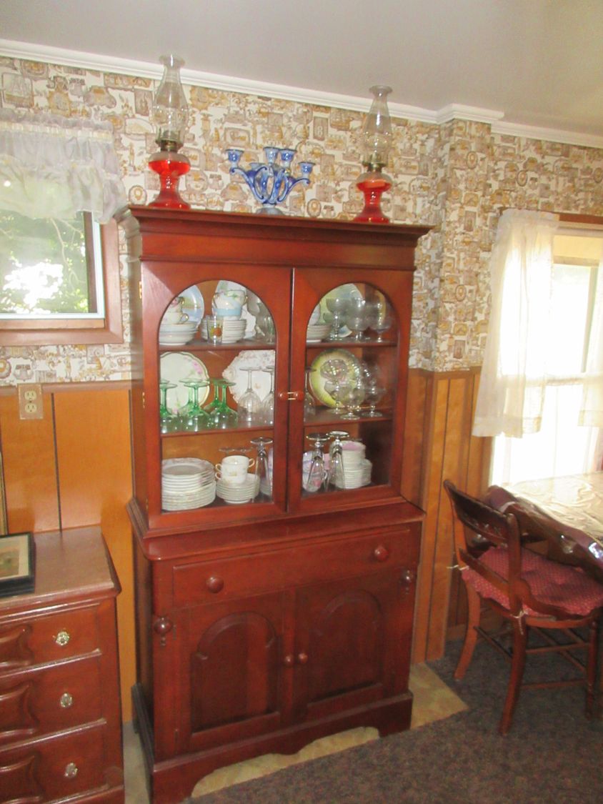 HOUSEHOLD: Dining Room Set (Table, 6 Chairs, Hutch/Buffet); Curio Cabinet; China Cabinet; Claw Footed 4 Drawer Secretary; Drop Leaf Gate Leg Table; Prism Chandelier; Pedestal Round Stand; Hutch; Bookcase; Loveseat; Recliner; Upholstered Chair; Tall Kitchen Cabinet/Closet; Hall Trees; Lamps; Stands; Single Bed; Dressers; Double Bed; Cedar Chests; Trunk; Maple Dresser; Full Size Bed; (2) Samsung TV’s; Magnavox DVD/VHS Player w/ Stand; File Cabinets; Vacuum Cleaner; Microwave; Kitchenware; Framed Pictures; Sentry Safe ; Portable Sewing Machine; Linens; Blankets; Christmas Décor; Figurines; Canning Kettles; Aluminum Folding Table; 8 Gallon Crock; Porch Swing