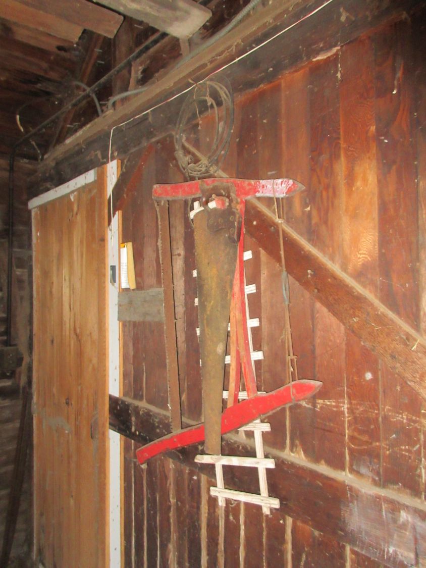 TOOLS AND GARAGE ITEMS: Antique Woodworking Trunk; Workbench w/ Vise; Mc Couloch Trimmer; Pole Saw; Wheelbarrow; Ladders; Fencing; Saw Horses; Hand Tools; Yard Tools; Much More